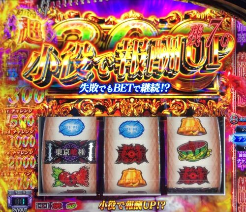 東京喰種のATで、鯱と対決中にカクガンを引きました! 勝利して超バイツになった。 タイトル画面でチェリー。